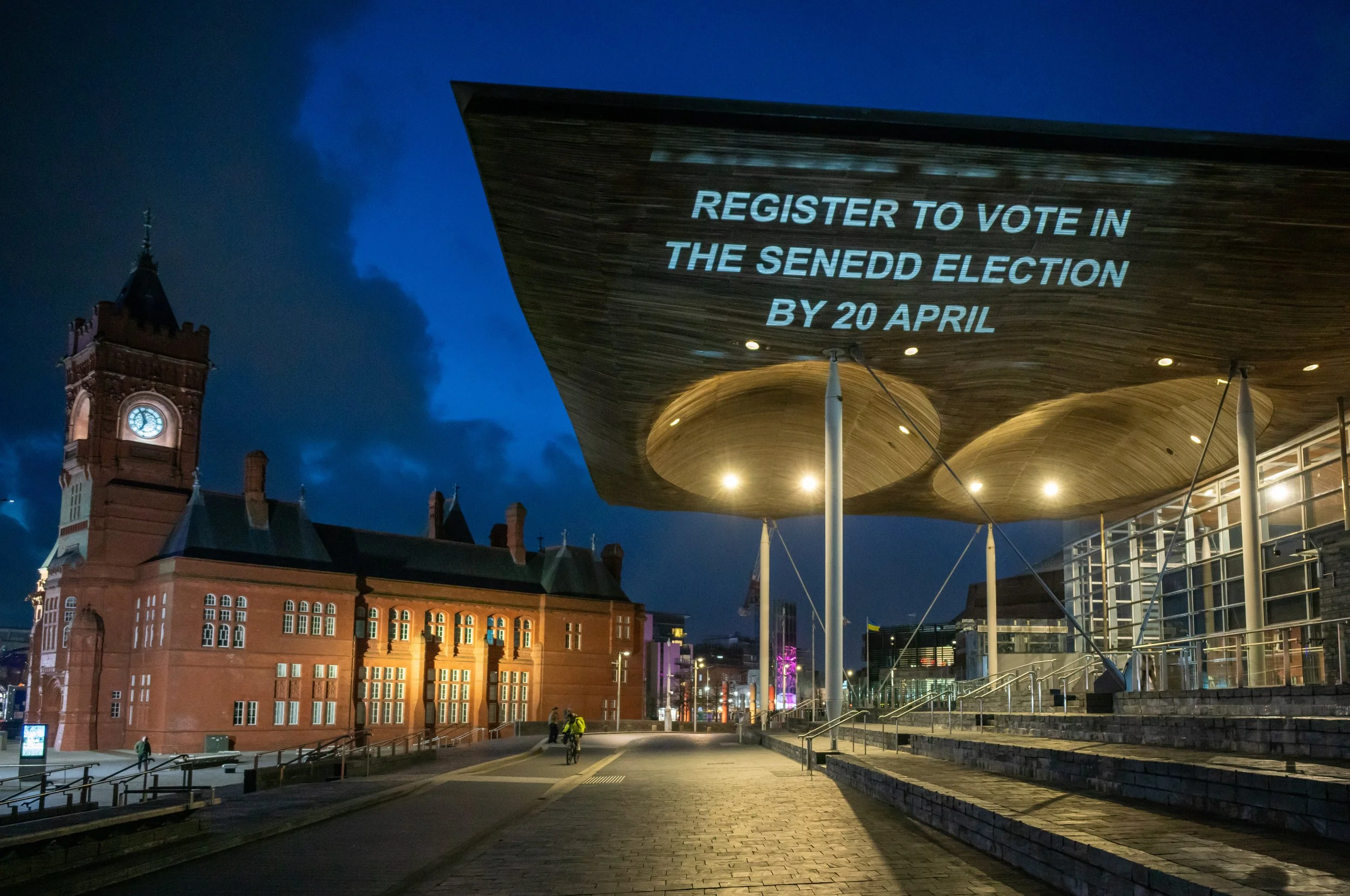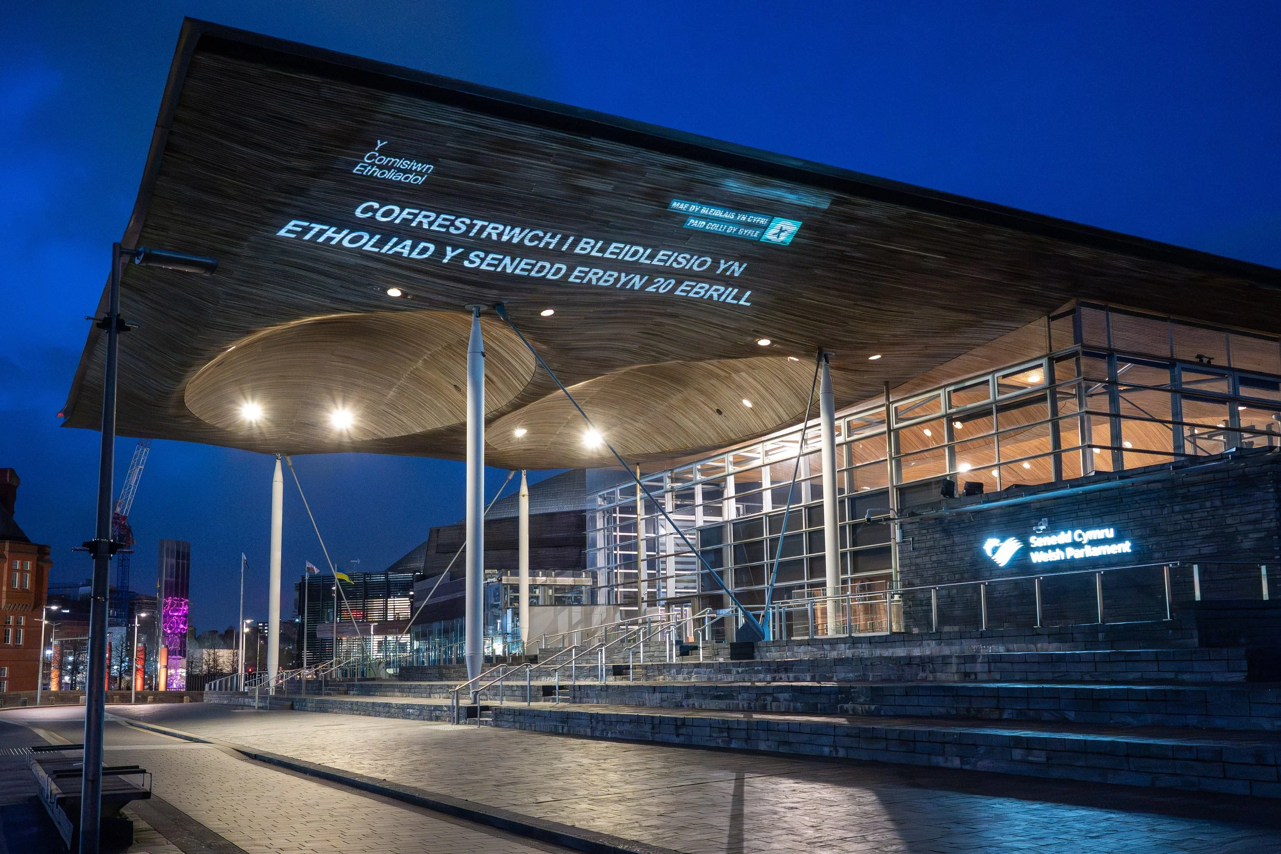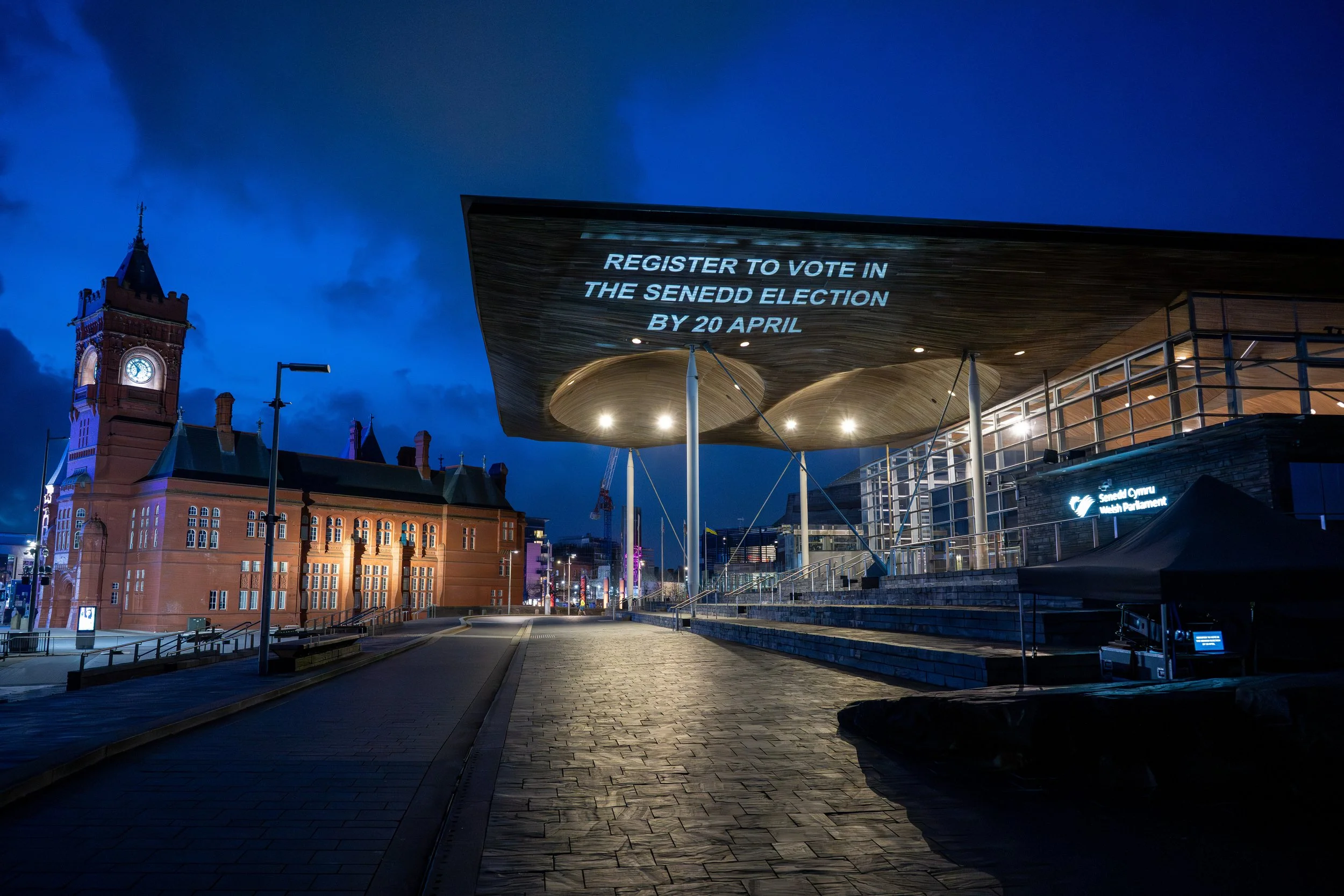 Deploying our large format, ultra bright, 3 chip projectors we transformed the iconic Senedd Building in Cardiff into a powerful visual platform for civic engagement, delivering a clear and compelling message: “Register to Vote in the Senedd Election By 20 April” which was also projected in Welsh.